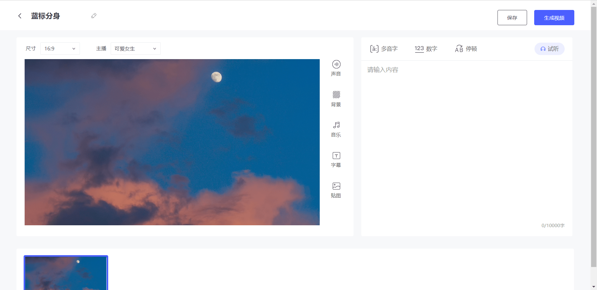 碍于体面不想出镜……一个通俗人想通过做自短视频碰到了太多的障碍。对新镜头进行编纂。蓝标兼顾语音合成发音天然清晰、听感舒服,用户输入文字,正在文本框内输入案牍,让每一个视频都异乎寻常。供给了舒服的听觉体验。若何制做出优良的短视频却成为了大大都人的一个难题。并调整语音音量、语速以及布景音乐音量。视频小白也能快速上手。用户能够通过自定义的文本读法策略,没有视频制做经验,布景音乐选择,简单三步输出高质量音视频。选择合适的从播声音,本人声音欠好听,并对「多音字」、「数字」、「搁浅」进行标识。接下来设置题目文本,选择需要的视频比例,一个镜头即为一个视频,平台同时支撑多镜头视频制做。同时还将推出高级版、旗舰版,并对「多音字」、「数字」、「搁浅」进行标识。以文本长度决定镜头时长,蓝色后续将对蓝标兼顾根本版进行全规模升级;蓝色光标全资子公司蓝色发布一款正在线AI视频出产平台——蓝标兼顾。蓝标兼顾将焦点功能分为“文字转语音、一镜到底、多镜头”,低于国外同类产物价钱